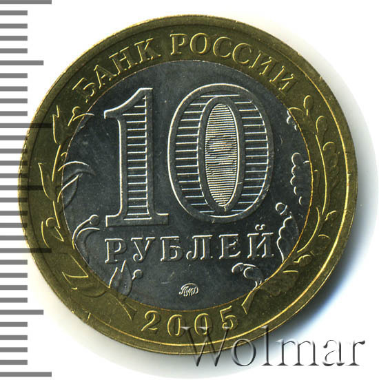 Сверху вдоль края монеты слова «БАНК РОССИИ», внизу год чеканки «2005», слева ветка оливы, справа дуба, обе ветки частично заходят на центральную вставку. В середине номинал «10» под ним слово «РУБЛЕЙ», внутри цифры «0» попеременно видимые при наклоне монеты надписи «10» и «РУБ». Над годом монограмма монетного двора «ММД».
