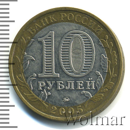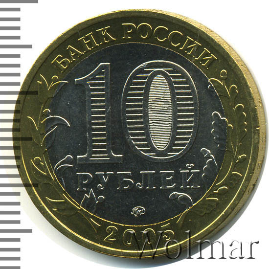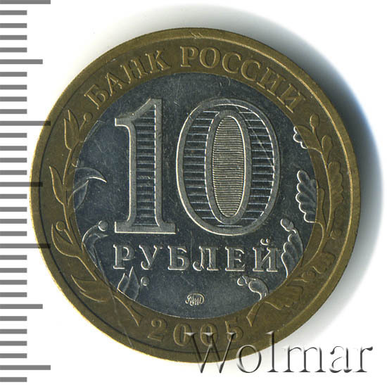 Сверху вдоль края монеты слова «БАНК РОССИИ», внизу год чеканки «2005», слева ветка оливы, справа дуба, обе ветки частично заходят на центральную вставку. В середине номинал «10» под ним слово «РУБЛЕЙ», внутри цифры «0» попеременно видимые при наклоне монеты надписи «10» и «РУБ». Над годом монограмма монетного двора «ММД».