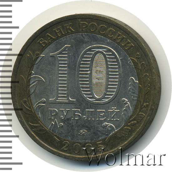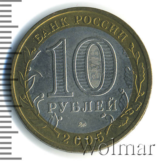 Сверху вдоль края монеты слова «БАНК РОССИИ», внизу год чеканки «2005», слева ветка оливы, справа дуба, обе ветки частично заходят на центральную вставку. В середине номинал «10» под ним слово «РУБЛЕЙ», внутри цифры «0» попеременно видимые при наклоне монеты надписи «10» и «РУБ». Над годом монограмма монетного двора «ММД».