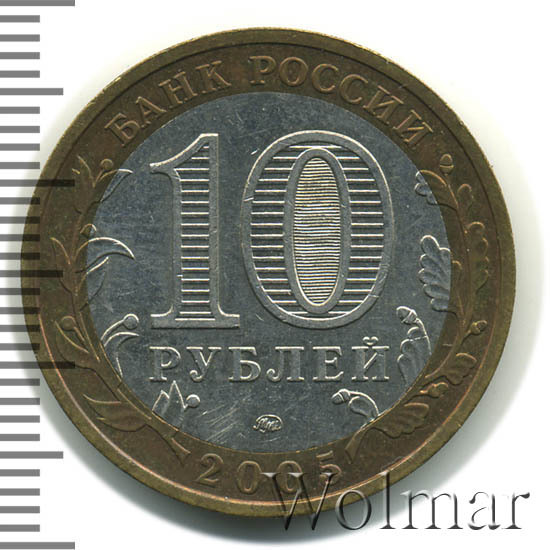 Сверху вдоль края монеты слова «БАНК РОССИИ», внизу год чеканки «2005», слева ветка оливы, справа дуба, обе ветки частично заходят на центральную вставку. В середине номинал «10» под ним слово «РУБЛЕЙ», внутри цифры «0» попеременно видимые при наклоне монеты надписи «10» и «РУБ». Над годом монограмма монетного двора «ММД».