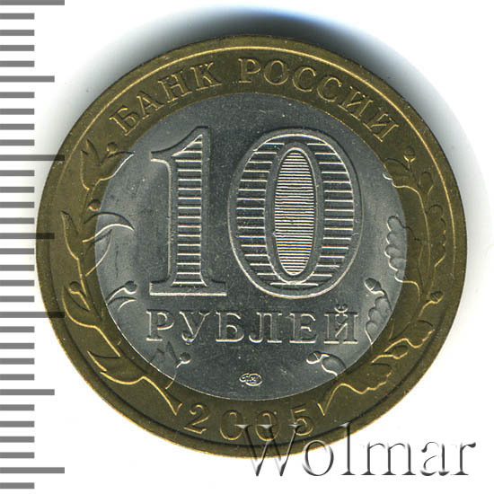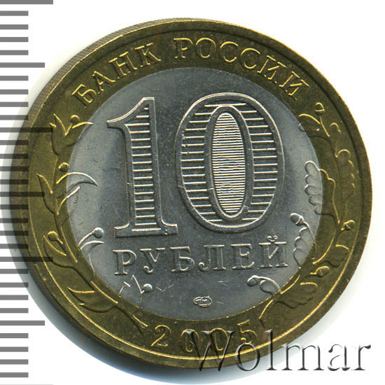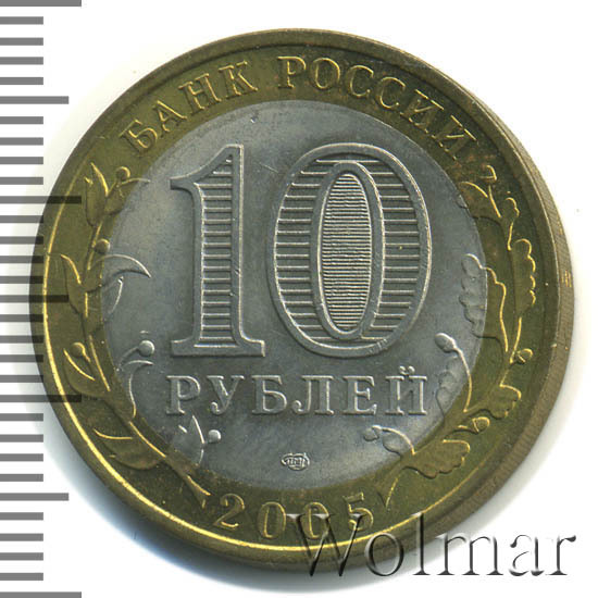 Сверху вдоль края монеты слова «БАНК РОССИИ», внизу год чеканки «2005», слева ветка оливы, справа дуба, обе ветки частично заходят на центральную вставку. В середине номинал «10» под ним слово «РУБЛЕЙ», внутри цифры «0» попеременно видимые при наклоне монеты надписи «10» и «РУБ». Над годом монограмма монетного двора «СПМД».
