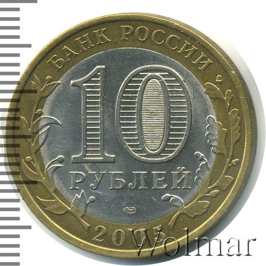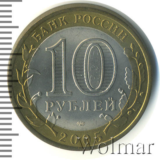 Сверху вдоль края монеты слова «БАНК РОССИИ», внизу год чеканки «2005», слева ветка оливы, справа дуба, обе ветки частично заходят на центральную вставку. В середине номинал «10» под ним слово «РУБЛЕЙ», внутри цифры «0» попеременно видимые при наклоне монеты надписи «10» и «РУБ». Над годом монограмма монетного двора «СПМД».