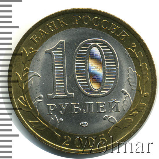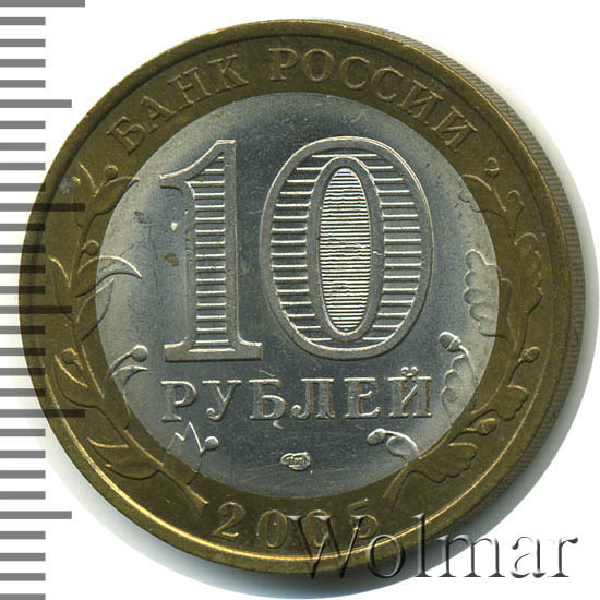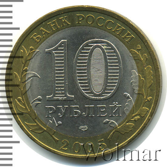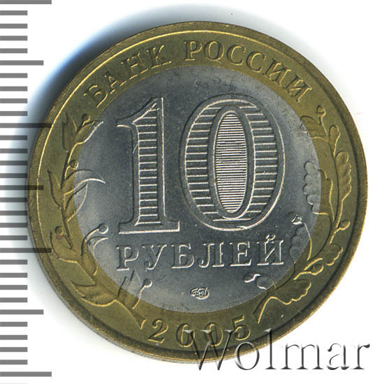 Сверху вдоль края монеты слова «БАНК РОССИИ», внизу год чеканки «2005», слева ветка оливы, справа дуба, обе ветки частично заходят на центральную вставку. В середине номинал «10» под ним слово «РУБЛЕЙ», внутри цифры «0» попеременно видимые при наклоне монеты надписи «10» и «РУБ». Над годом монограмма монетного двора «СПМД».