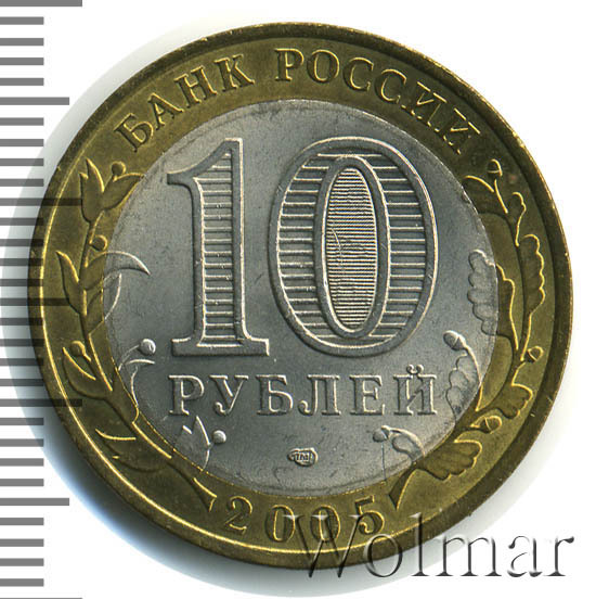 Сверху вдоль края монеты слова «БАНК РОССИИ», внизу год чеканки «2005», слева ветка оливы, справа дуба, обе ветки частично заходят на центральную вставку. В середине номинал «10» под ним слово «РУБЛЕЙ», внутри цифры «0» попеременно видимые при наклоне монеты надписи «10» и «РУБ». Над годом монограмма монетного двора «СПМД».