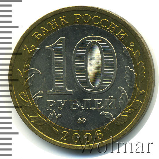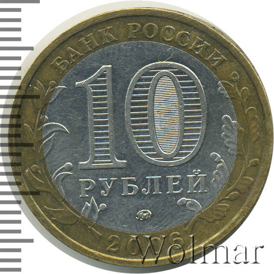 Сверху вдоль края монеты слова «БАНК РОССИИ», внизу год чеканки «2006», слева ветка оливы, справа дуба, обе ветки частично заходят на центральную вставку. В середине номинал «10» под ним слово «РУБЛЕЙ», внутри цифры «0» попеременно видимые при наклоне монеты надписи «10» и «РУБ». Над годом монограмма монетного двора «ММД».