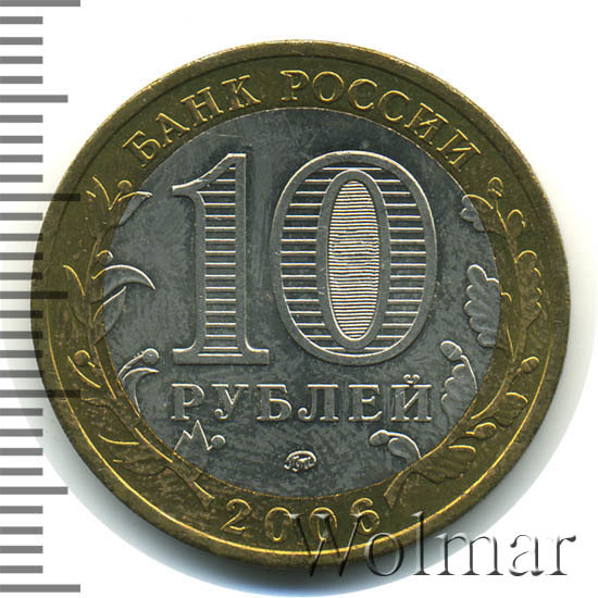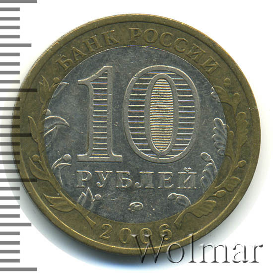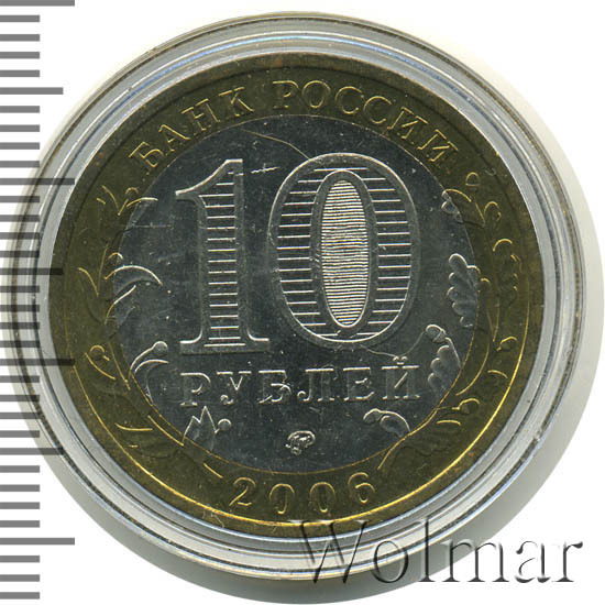 Сверху вдоль края монеты слова «БАНК РОССИИ», внизу год чеканки «2006», слева ветка оливы, справа дуба, обе ветки частично заходят на центральную вставку. В середине номинал «10» под ним слово «РУБЛЕЙ», внутри цифры «0» попеременно видимые при наклоне монеты надписи «10» и «РУБ». Над годом монограмма монетного двора «ММД».