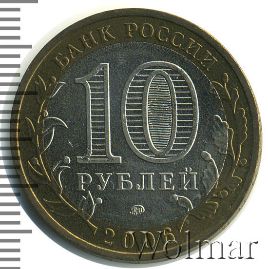 Сверху вдоль края монеты слова «БАНК РОССИИ», внизу год чеканки «2006», слева ветка оливы, справа дуба, обе ветки частично заходят на центральную вставку. В середине номинал «10» под ним слово «РУБЛЕЙ», внутри цифры «0» попеременно видимые при наклоне монеты надписи «10» и «РУБ». Над годом монограмма монетного двора «ММД».