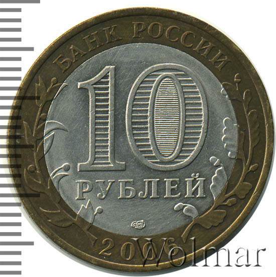 Сверху вдоль края монеты слова «БАНК РОССИИ», внизу год чеканки «2006», слева ветка оливы, справа дуба, обе ветки частично заходят на центральную вставку. В середине номинал «10» под ним слово «РУБЛЕЙ», внутри цифры «0» попеременно видимые при наклоне монеты надписи «10» и «РУБ». Над годом монограмма монетного двора «СПМД».