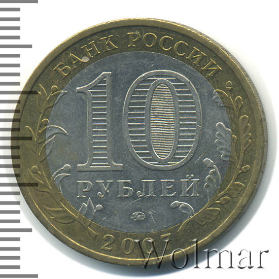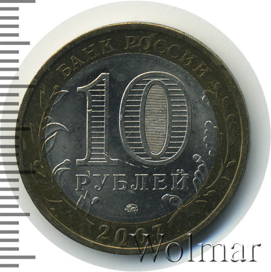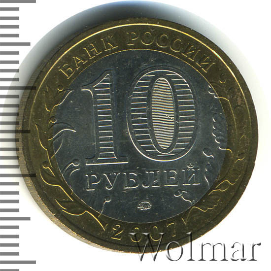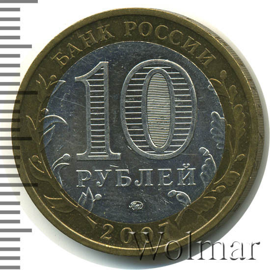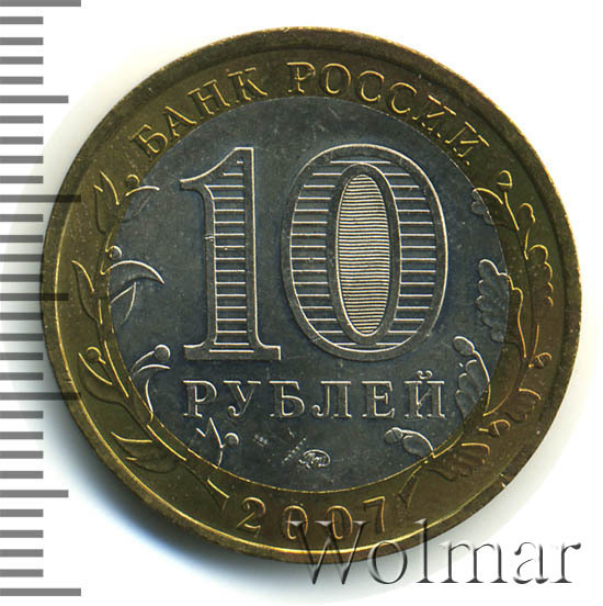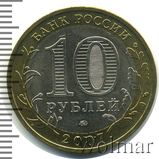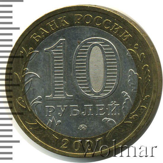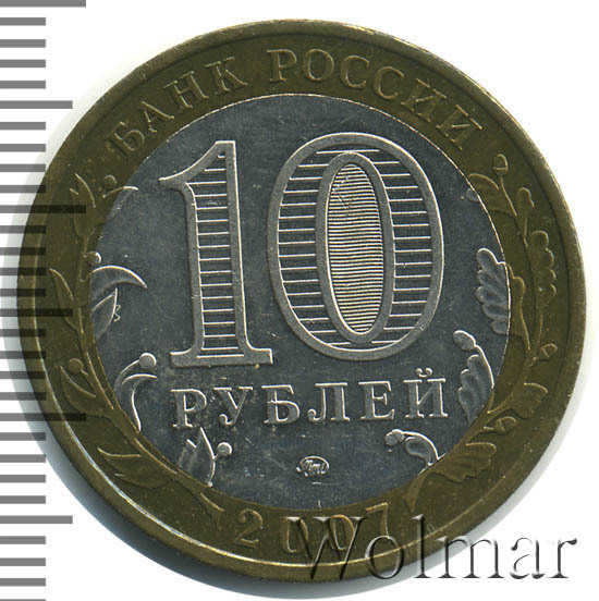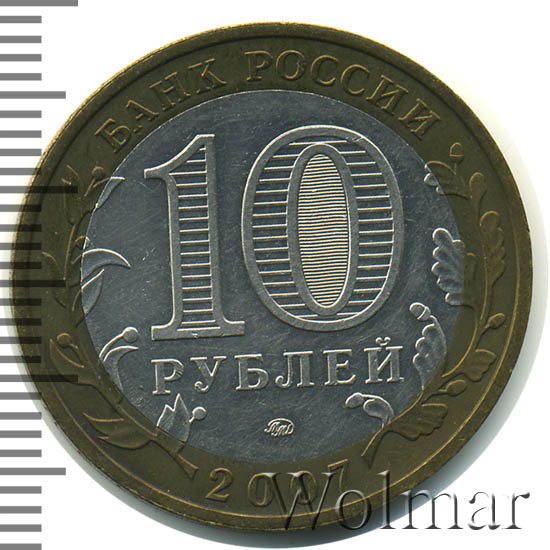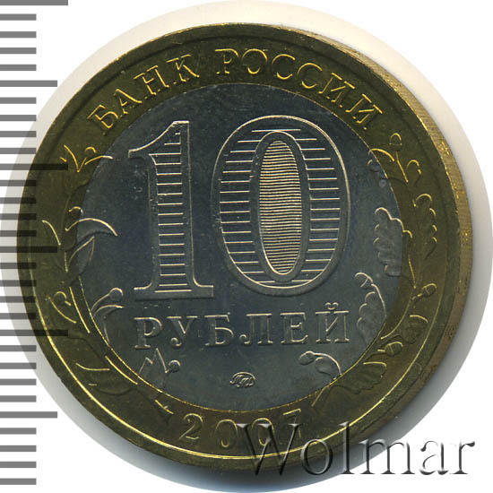 Сверху вдоль края монеты слова «БАНК РОССИИ», внизу год чеканки «2007», слева ветка оливы, справа дуба, обе ветки частично заходят на центральную вставку. В середине номинал «10» под ним слово «РУБЛЕЙ», внутри цифры «0» попеременно видимые при наклоне монеты надписи «10» и «РУБ». Над годом монограмма монетного двора «ММД».