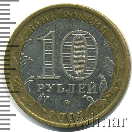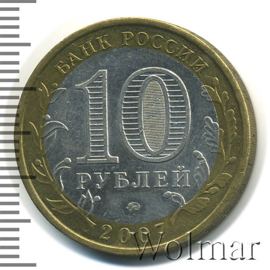 Сверху вдоль края монеты слова «БАНК РОССИИ», внизу год чеканки «2007», слева ветка оливы, справа дуба, обе ветки частично заходят на центральную вставку. В середине номинал «10» под ним слово «РУБЛЕЙ», внутри цифры «0» попеременно видимые при наклоне монеты надписи «10» и «РУБ». Над годом монограмма монетного двора «ММД».