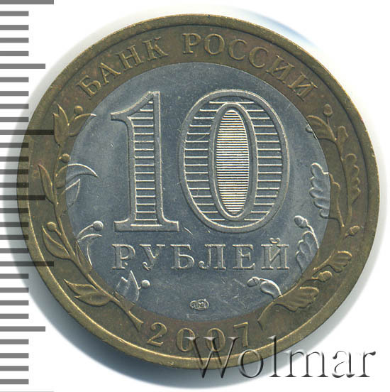 Сверху вдоль края монеты слова «БАНК РОССИИ», внизу год чеканки «2007», слева ветка оливы, справа дуба, обе ветки частично заходят на центральную вставку. В середине номинал «10» под ним слово «РУБЛЕЙ», внутри цифры «0» попеременно видимые при наклоне монеты надписи «10» и «РУБ». Над годом монограмма монетного двора «СПМД».