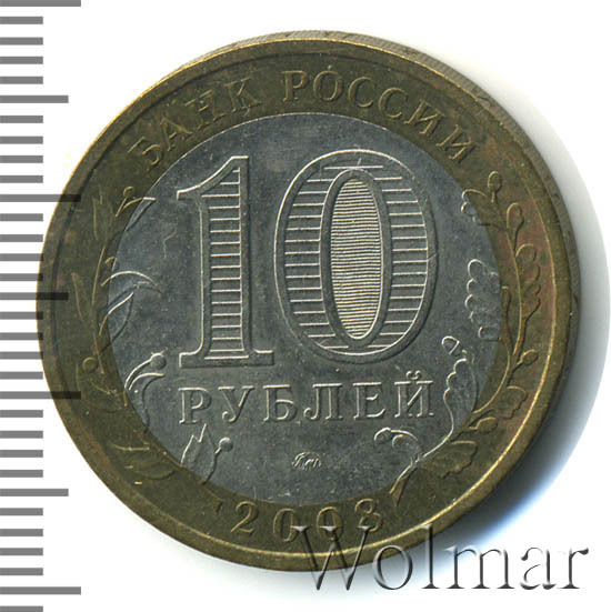 Сверху вдоль края монеты слова «БАНК РОССИИ», внизу год чеканки «2008», слева ветка оливы, справа дуба, обе ветки частично заходят на центральную вставку. В середине номинал «10» под ним слово «РУБЛЕЙ», внутри цифры «0» попеременно видимые при наклоне монеты надписи «10» и «РУБ». Над годом монограмма монетного двора «ММД».