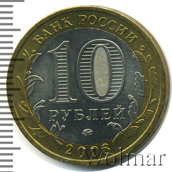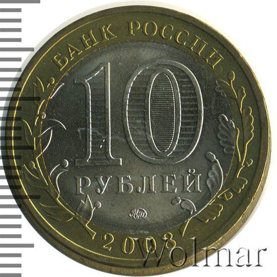Сверху вдоль края монеты слова «БАНК РОССИИ», внизу год чеканки «2008», слева ветка оливы, справа дуба, обе ветки частично заходят на центральную вставку. В середине номинал «10» под ним слово «РУБЛЕЙ», внутри цифры «0» попеременно видимые при наклоне монеты надписи «10» и «РУБ». Над годом монограмма монетного двора «ММД».