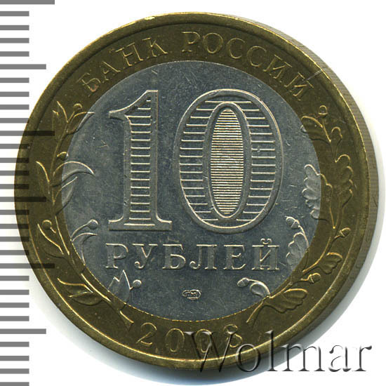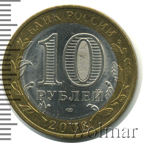 Сверху вдоль края монеты слова «БАНК РОССИИ», внизу год чеканки «2008», слева ветка оливы, справа дуба, обе ветки частично заходят на центральную вставку. В середине номинал «10» под ним слово «РУБЛЕЙ», внутри цифры «0» попеременно видимые при наклоне монеты надписи «10» и «РУБ». Над годом монограмма монетного двора «СПМД».