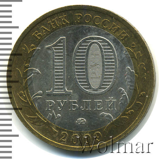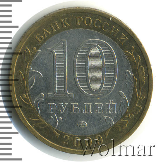 Сверху вдоль края монеты слова «БАНК РОССИИ», внизу год чеканки «2009», слева ветка оливы, справа дуба, обе ветки частично заходят на центральную вставку. В середине номинал «10» под ним слово «РУБЛЕЙ», внутри цифры «0» попеременно видимые при наклоне монеты надписи «10» и «РУБ». Над годом монограмма монетного двора «ММД».