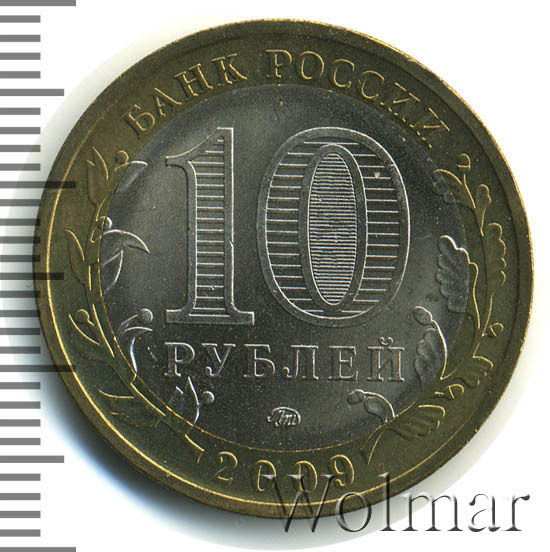 Сверху вдоль края монеты слова «БАНК РОССИИ», внизу год чеканки «2009», слева ветка оливы, справа дуба, обе ветки частично заходят на центральную вставку. В середине номинал «10» под ним слово «РУБЛЕЙ», внутри цифры «0» попеременно видимые при наклоне монеты надписи «10» и «РУБ». Над годом монограмма монетного двора «ММД».