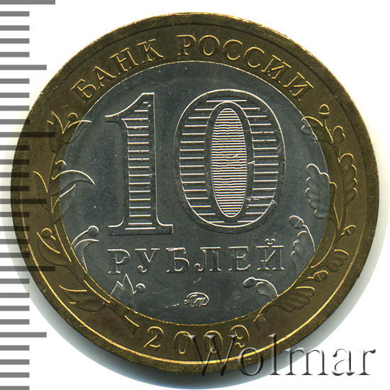 Сверху вдоль края монеты слова «БАНК РОССИИ», внизу год чеканки «2009», слева ветка оливы, справа дуба, обе ветки частично заходят на центральную вставку. В середине номинал «10» под ним слово «РУБЛЕЙ», внутри цифры «0» попеременно видимые при наклоне монеты надписи «10» и «РУБ». Над годом монограмма монетного двора «ММД».
