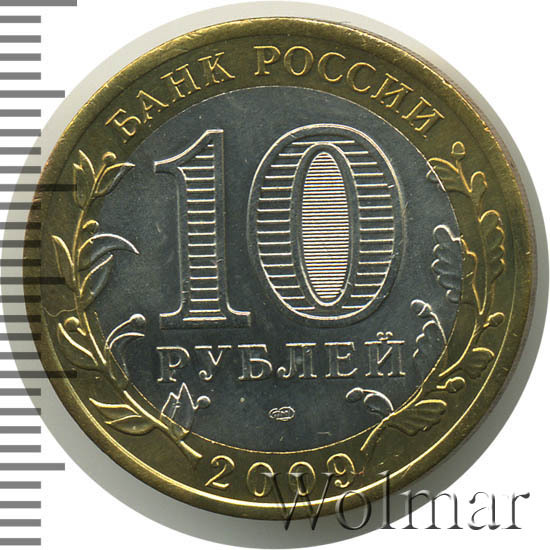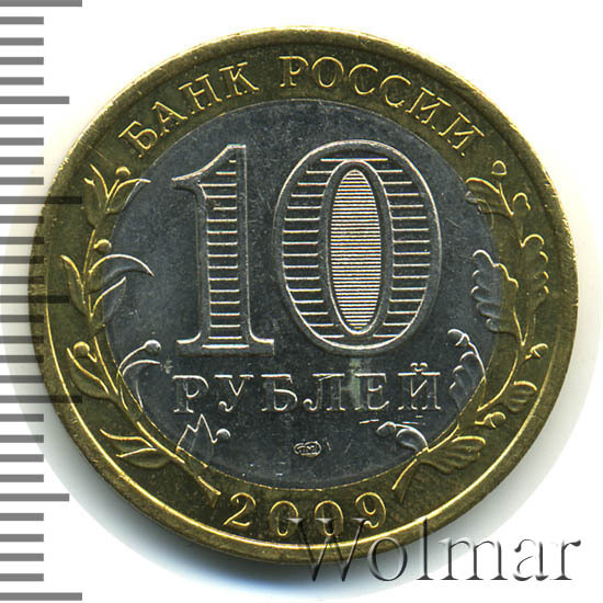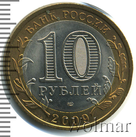 Сверху вдоль края монеты слова «БАНК РОССИИ», внизу год чеканки «2009», слева ветка оливы, справа дуба, обе ветки частично заходят на центральную вставку. В середине номинал «10» под ним слово «РУБЛЕЙ», внутри цифры «0» попеременно видимые при наклоне монеты надписи «10» и «РУБ». Над годом монограмма монетного двора «СПМД».