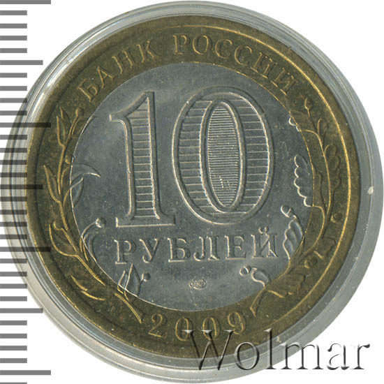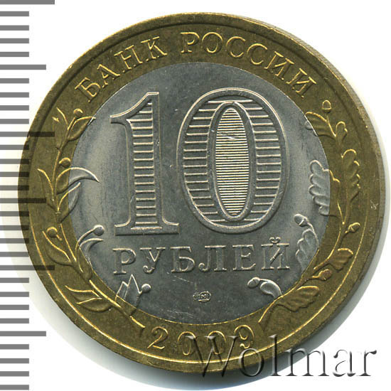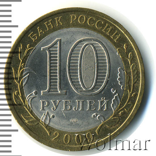 Сверху вдоль края монеты слова «БАНК РОССИИ», внизу год чеканки «2009», слева ветка оливы, справа дуба, обе ветки частично заходят на центральную вставку. В середине номинал «10» под ним слово «РУБЛЕЙ», внутри цифры «0» попеременно видимые при наклоне монеты надписи «10» и «РУБ». Над годом монограмма монетного двора «СПМД».