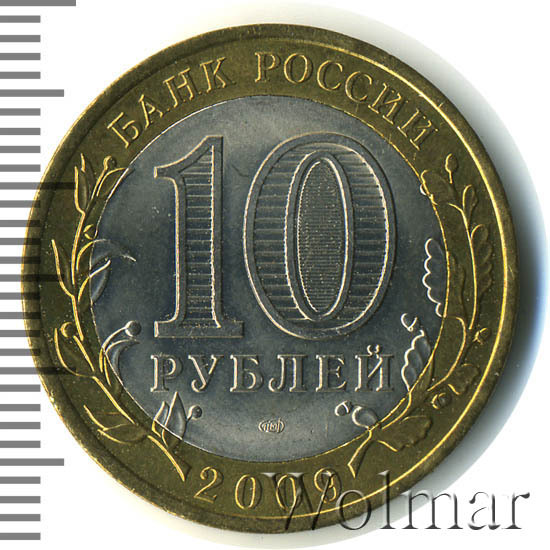 Сверху вдоль края монеты слова «БАНК РОССИИ», внизу год чеканки «2009», слева ветка оливы, справа дуба, обе ветки частично заходят на центральную вставку. В середине номинал «10» под ним слово «РУБЛЕЙ», внутри цифры «0» попеременно видимые при наклоне монеты надписи «10» и «РУБ». Над годом монограмма монетного двора «СПМД».