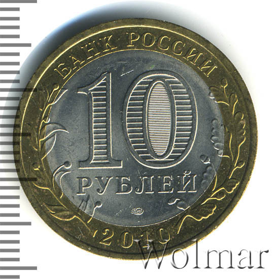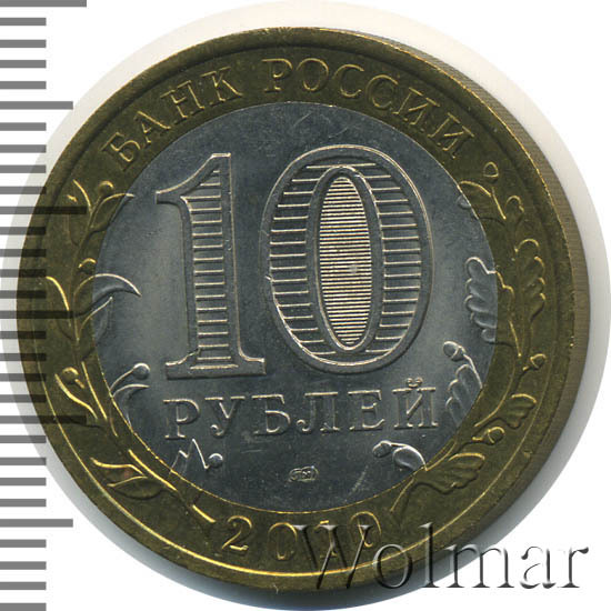 Сверху вдоль края монеты слова «БАНК РОССИИ», внизу год чеканки «2010», слева ветка оливы, справа дуба, обе ветки частично заходят на центральную вставку. В середине номинал «10» под ним слово «РУБЛЕЙ», внутри цифры «0» попеременно видимые при наклоне монеты надписи «10» и «РУБ». Над годом монограмма монетного двора «СПМД».