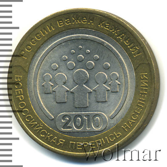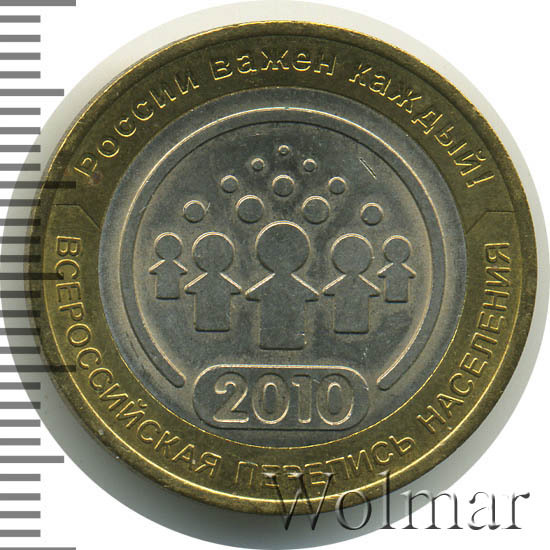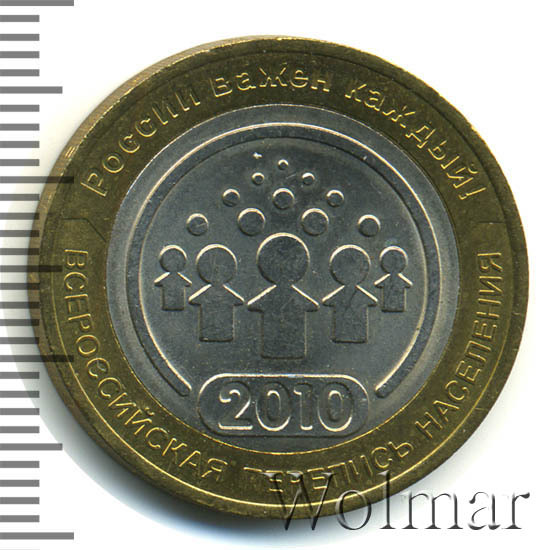 В центре диска - эмблема переписи населения с датой «2010», на кольце по окружности - надписи: вверху - «РОССИИ ВАЖЕН КАЖДЫЙ», внизу - «ВСЕРОССИЙСКАЯ ПЕРЕПИСЬ НАСЕЛЕНИЯ».