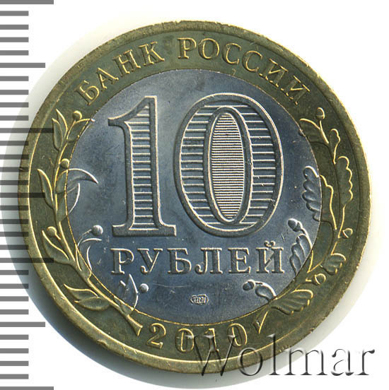 Сверху вдоль края монеты слова «БАНК РОССИИ», внизу год чеканки «2010», слева ветка оливы, справа дуба, обе ветки частично заходят на центральную вставку. В середине номинал «10» под ним слово «РУБЛЕЙ», внутри цифры «0» попеременно видимые при наклоне монеты надписи «10» и «РУБ». Над годом монограмма монетного двора «СПМД».