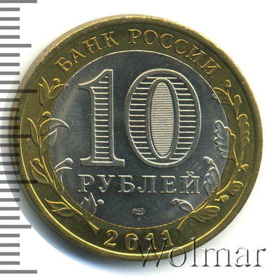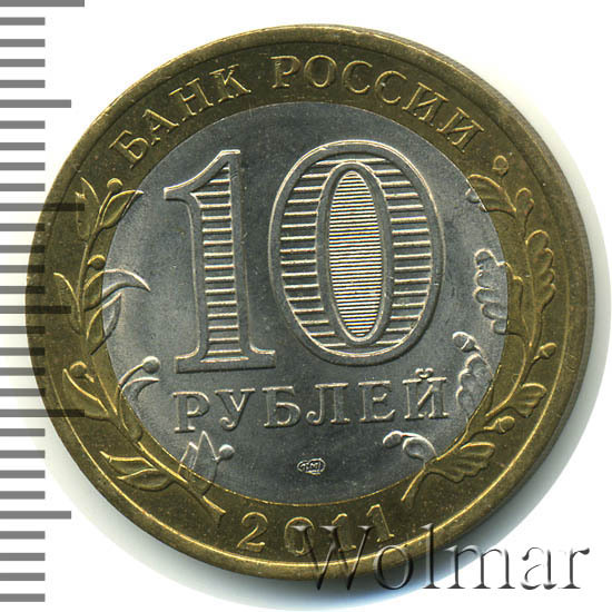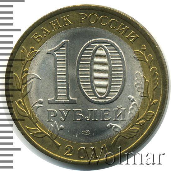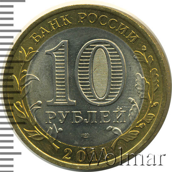 Сверху вдоль края монеты слова «БАНК РОССИИ», внизу год чеканки «2011», слева ветка оливы, справа дуба, обе ветки частично заходят на центральную вставку. В середине номинал «10» под ним слово «РУБЛЕЙ», внутри цифры «0» попеременно видимые при наклоне монеты надписи «10» и «РУБ». Над годом монограмма монетного двора «СПМД».