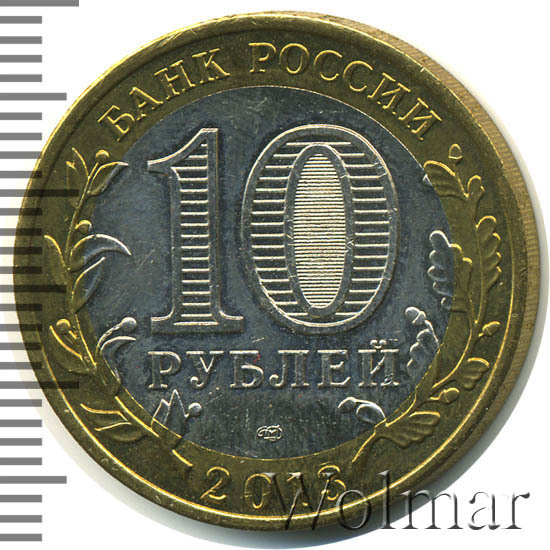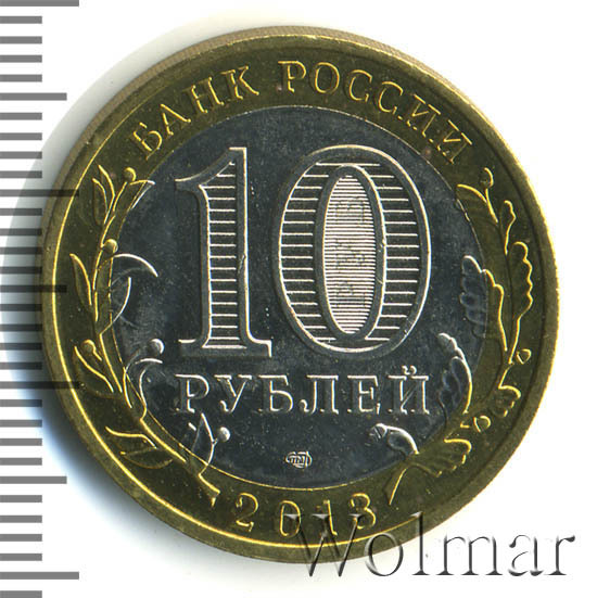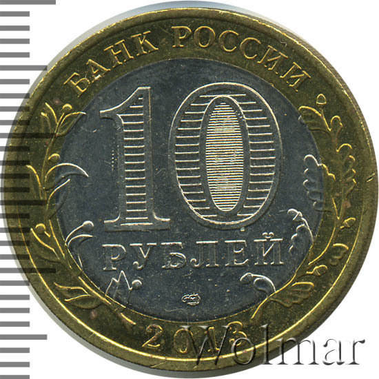 Сверху вдоль края монеты слова «БАНК РОССИИ», внизу год чеканки «2013», слева ветка оливы, справа дуба, обе ветки частично заходят на центральную вставку. В середине номинал «10» под ним слово «РУБЛЕЙ», внутри цифры «0» попеременно видимые при наклоне монеты надписи «10» и «РУБ». Над годом монограмма монетного двора «СПМД».