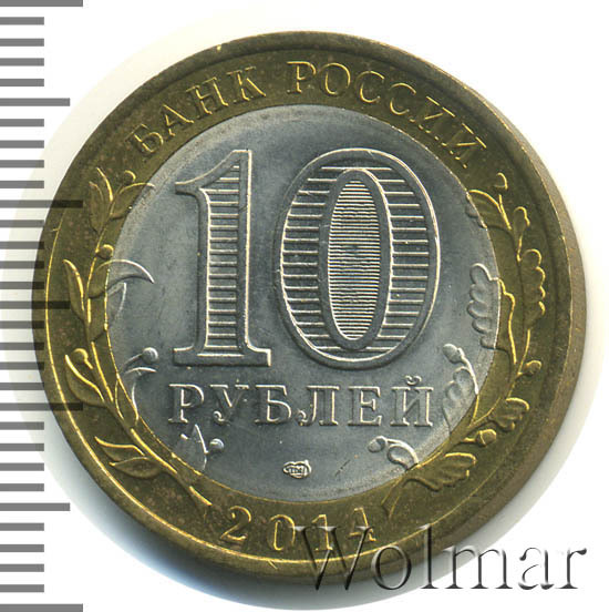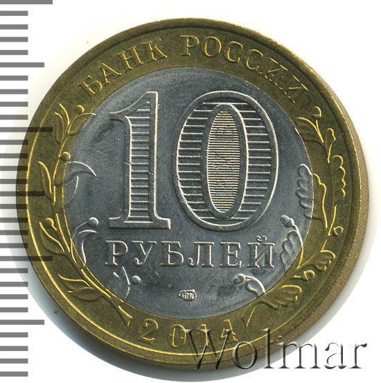 Сверху вдоль края монеты слова «БАНК РОССИИ», внизу год чеканки «2014», слева ветка оливы, справа дуба, обе ветки частично заходят на центральную вставку. В середине номинал «10» под ним слово «РУБЛЕЙ», внутри цифры «0» попеременно видимые при наклоне монеты надписи «10» и «РУБ». Над годом монограмма монетного двора «СПМД».