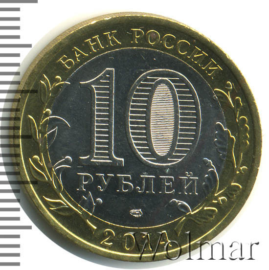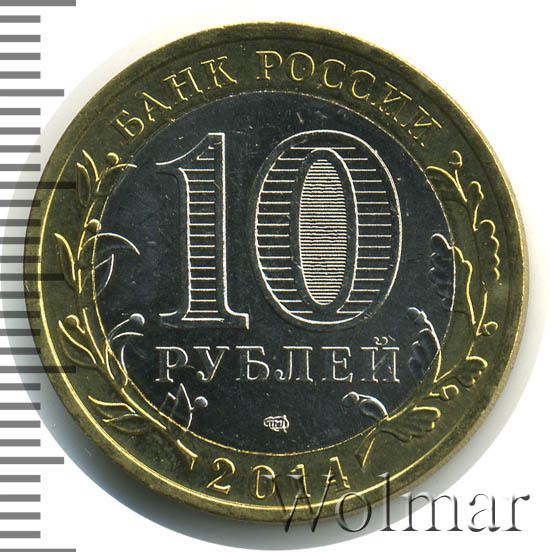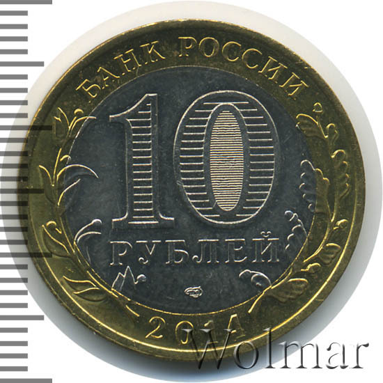 Сверху вдоль края монеты слова «БАНК РОССИИ», внизу год чеканки «2014», слева ветка оливы, справа дуба, обе ветки частично заходят на центральную вставку. В середине номинал «10» под ним слово «РУБЛЕЙ», внутри цифры «0» попеременно видимые при наклоне монеты надписи «10» и «РУБ». Над годом монограмма монетного двора «СПМД».