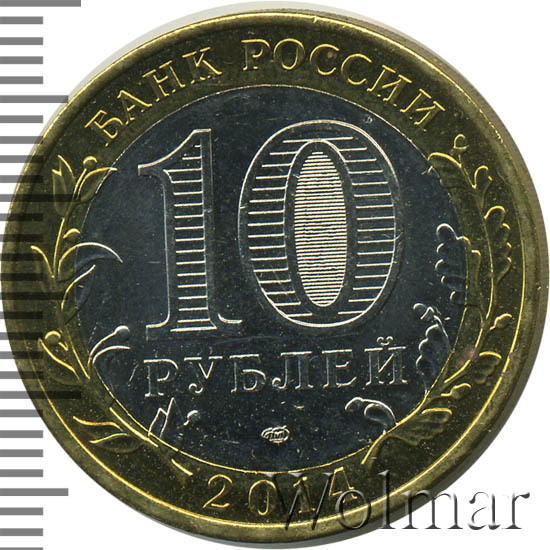 Сверху вдоль края монеты слова «БАНК РОССИИ», внизу год чеканки «2014», слева ветка оливы, справа дуба, обе ветки частично заходят на центральную вставку. В середине номинал «10» под ним слово «РУБЛЕЙ», внутри цифры «0» попеременно видимые при наклоне монеты надписи «10» и «РУБ». Над годом монограмма монетного двора «СПМД».