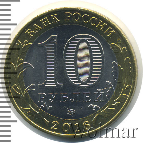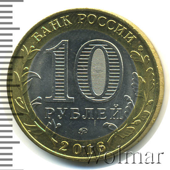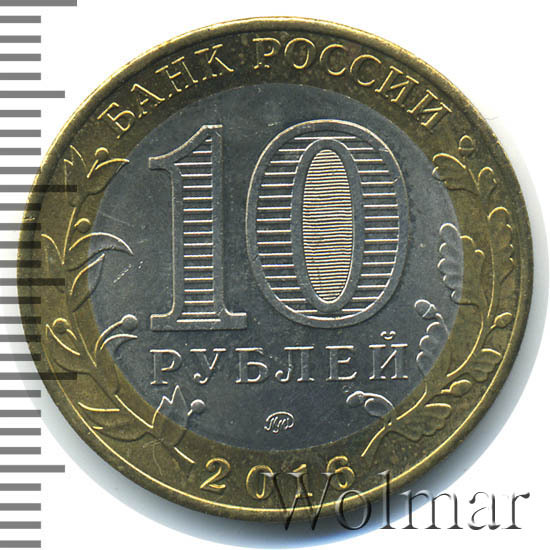 На кольце по окружности расположены надписи: в верхней части — «БАНК РОССИИ», в нижней части – «2016». Слева и справа на внешнем кольце расположены изображения ветви лавра и дуба, соответственно, элементы изображения которых переходят на диск. В центре диска расположены число «10» и надпись «РУБЛЕЙ» под ним, обозначающие номинал монеты. Внутри цифры «0» имеется защитный элемент в виде числа «10» и надписи «РУБ», наблюдаемых под разными углами зрения к плоскости монеты. В нижней части диска расположен товарный знак монетного двора.