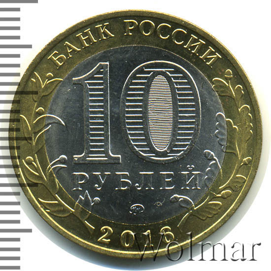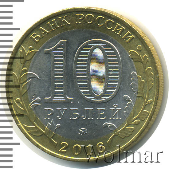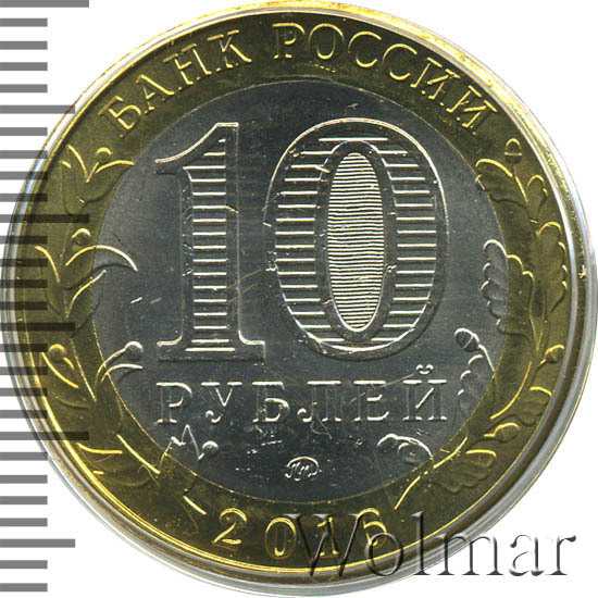 В верхней части — «БАНК РОССИИ», в нижней части — «2016». Слева и справа на внешнем кольце расположены изображения ветви лавра и дуба соответственно, элементы изображения которых переходят на диск. В центре диска расположены число «10» и надпись «РУБЛЕЙ» под ним, обозначающие номинал монеты. Внутри цифры «0» имеется защитный элемент в виде числа «10» и надписи «РУБ», наблюдаемых под разными углами зрения к плоскости монеты. В нижней части диска расположен товарный знак монетного двора.