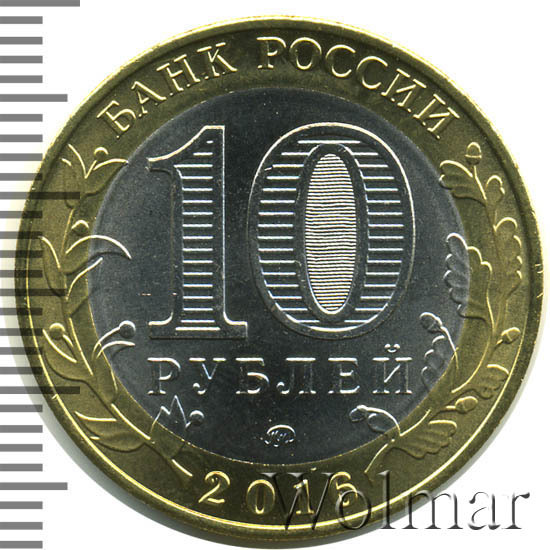 В верхней части — «БАНК РОССИИ», в нижней части — «2016». Слева и справа на внешнем кольце расположены изображения ветви лавра и дуба соответственно, элементы изображения которых переходят на диск. В центре диска расположены число «10» и надпись «РУБЛЕЙ» под ним, обозначающие номинал монеты. Внутри цифры «0» имеется защитный элемент в виде числа «10» и надписи «РУБ», наблюдаемых под разными углами зрения к плоскости монеты. В нижней части диска расположен товарный знак монетного двора.