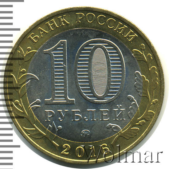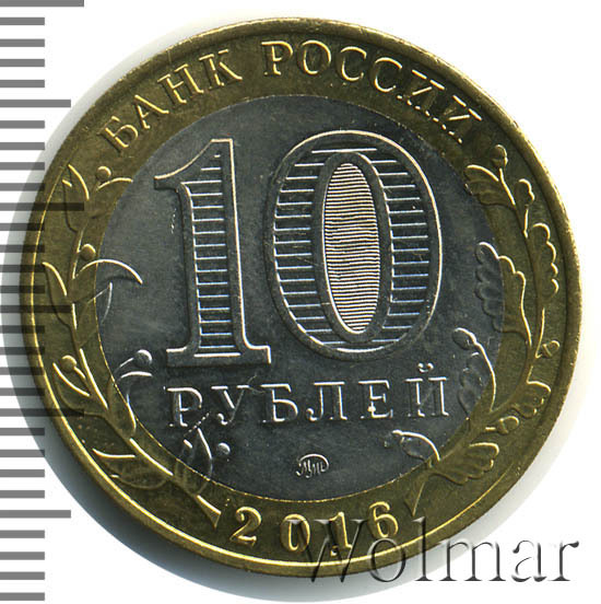 В верхней части — «БАНК РОССИИ», в нижней части — «2016». Слева и справа на внешнем кольце расположены изображения ветви лавра и дуба соответственно, элементы изображения которых переходят на диск. В центре диска расположены число «10» и надпись «РУБЛЕЙ» под ним, обозначающие номинал монеты. Внутри цифры «0» имеется защитный элемент в виде числа «10» и надписи «РУБ», наблюдаемых под разными углами зрения к плоскости монеты. В нижней части диска расположен товарный знак монетного двора.