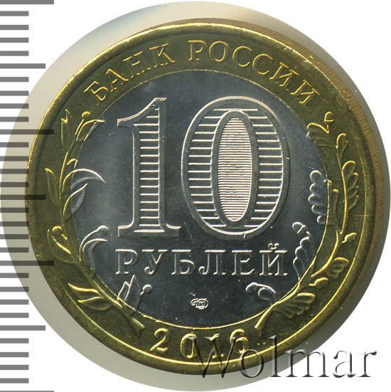В верхней части — «БАНК РОССИИ», в нижней части — «2016». Слева и справа на внешнем кольце расположены изображения ветви лавра и дуба соответственно, элементы изображения которых переходят на диск. В центре диска расположены число «10» и надпись «РУБЛЕЙ» под ним, обозначающие номинал монеты. Внутри цифры «0» имеется защитный элемент в виде числа «10» и надписи «РУБ», наблюдаемых под разными углами зрения к плоскости монеты. В нижней части диска расположен товарный знак монетного двора.