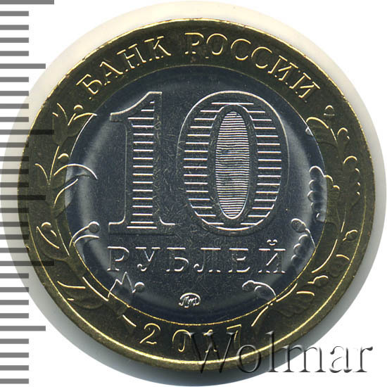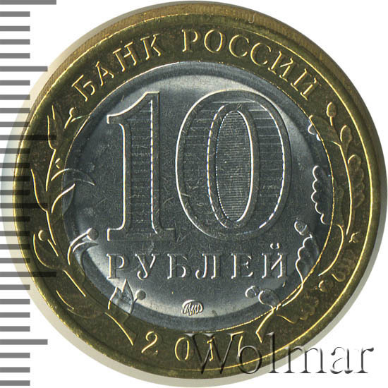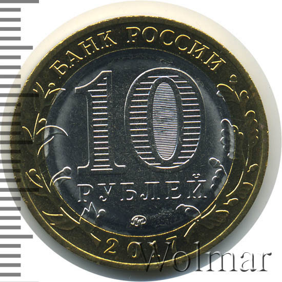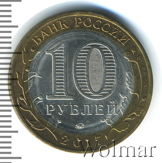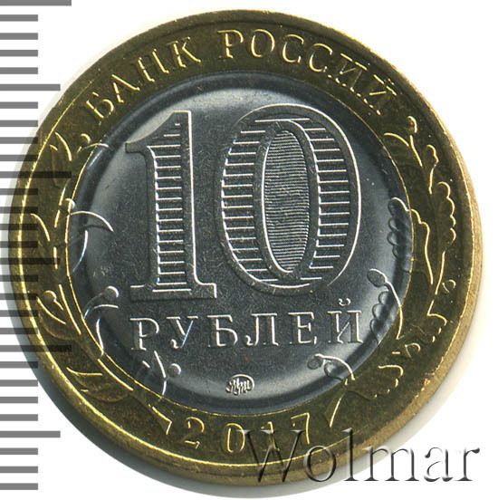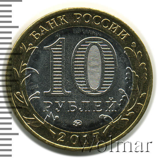 В верхней части — «БАНК РОССИИ», в нижней части — «2017». Слева и справа на внешнем кольце расположены изображения ветви лавра и дуба соответственно, элементы изображения которых переходят на диск. В центре диска расположены число «10» и надпись «РУБЛЕЙ» под ним, обозначающие номинал монеты. Внутри цифры «0» имеется защитный элемент в виде числа «10» и надписи «РУБ», наблюдаемых под разными углами зрения к плоскости монеты. В нижней части диска расположен товарный знак монетного двора.