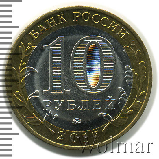 В верхней части — «БАНК РОССИИ», в нижней части — «2017». Слева и справа на внешнем кольце расположены изображения ветви лавра и дуба соответственно, элементы изображения которых переходят на диск. В центре диска расположены число «10» и надпись «РУБЛЕЙ» под ним, обозначающие номинал монеты. Внутри цифры «0» имеется защитный элемент в виде числа «10» и надписи «РУБ», наблюдаемых под разными углами зрения к плоскости монеты. В нижней части диска расположен товарный знак монетного двора.