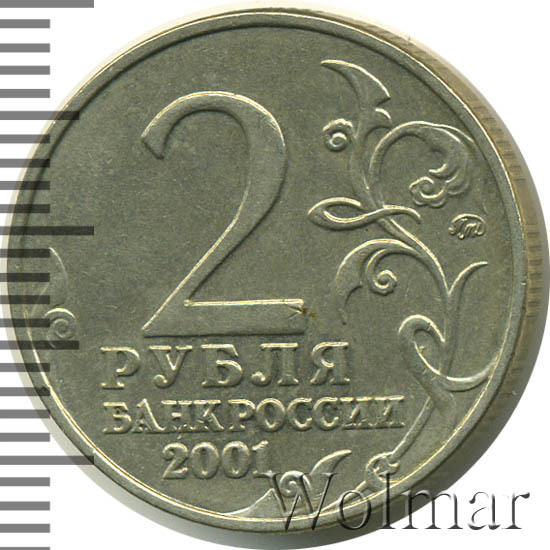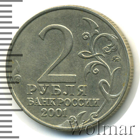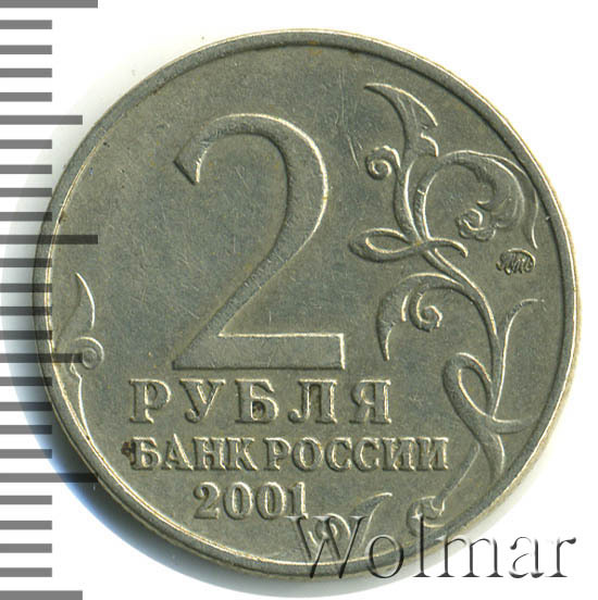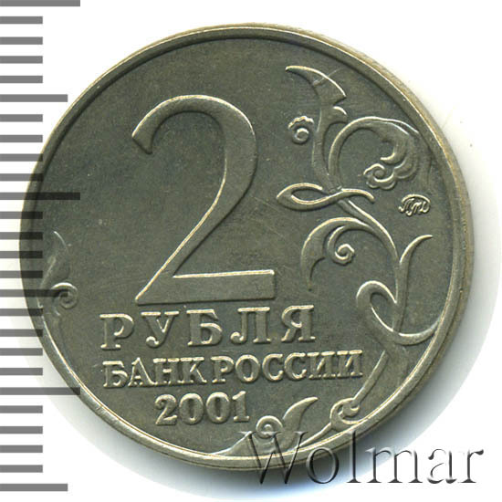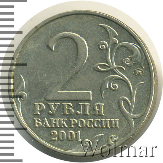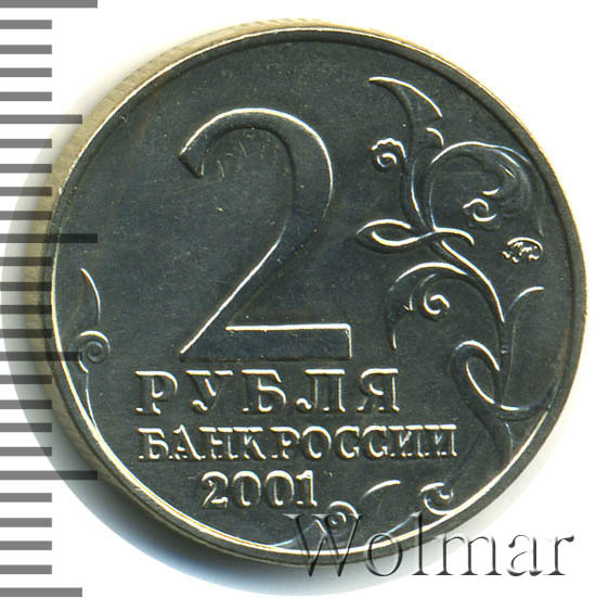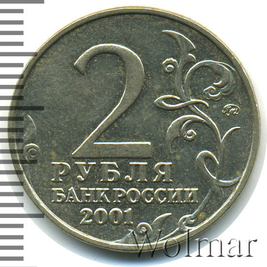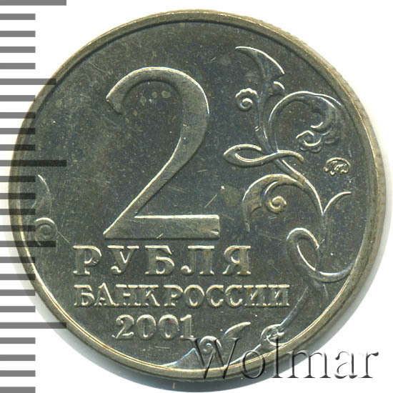 В середине немного смещенная влево и вверх цифра «2», обозначающая достоинство монеты, ниже слово «РУБЛЯ», и под ним слова «БАНК РОССИИ», еще ниже год выпуска монеты «2001», в нижней части поля, слева и справа завитки растительного орнамента.