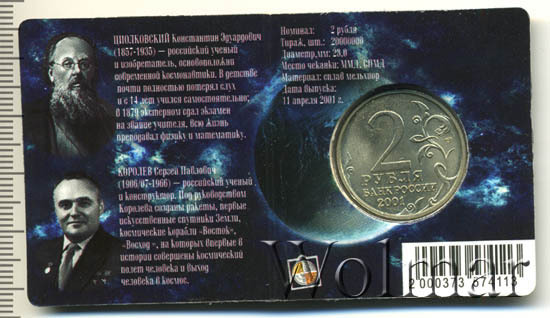 Цена на монету 2 рубля 2001 года СПМД Гагарин на сегодня, 11 марта 2026 года