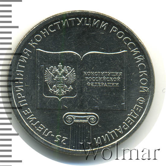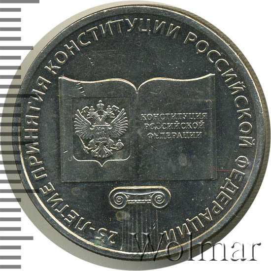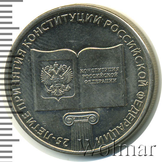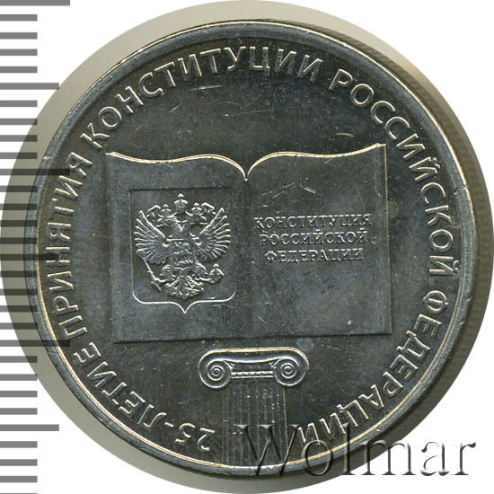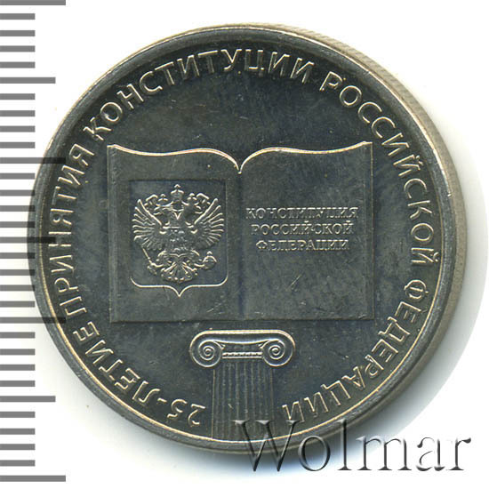 Рельефное изображение раскрытой книги с рисунком герба Российской Федерации на левой странице и надписью в три строки: «КОНСТИТУЦИЯ РОССИЙСКОЙ ФЕДЕРАЦИИ» на правой странице, под книгой — верхняя часть колонны с капителью ионического ордера. Вдоль канта имеется надпись по окружности: «25-ЛЕТИЕ ПРИНЯТИЯ КОНСТИТУЦИИ РОССИЙСКОЙ ФЕДЕРАЦИИ».
