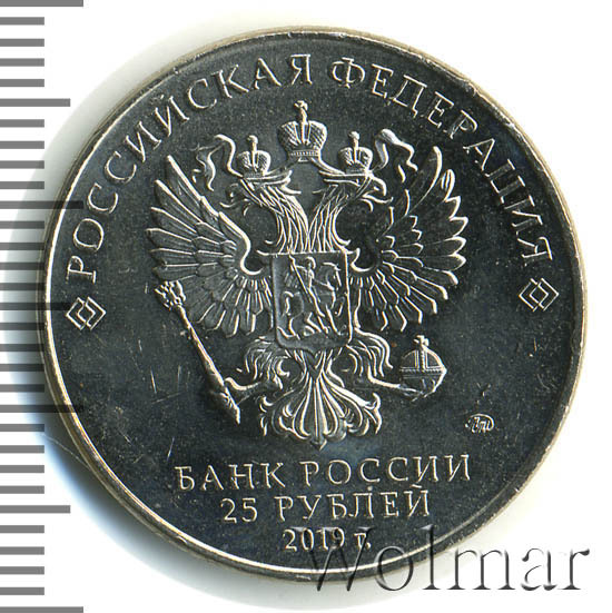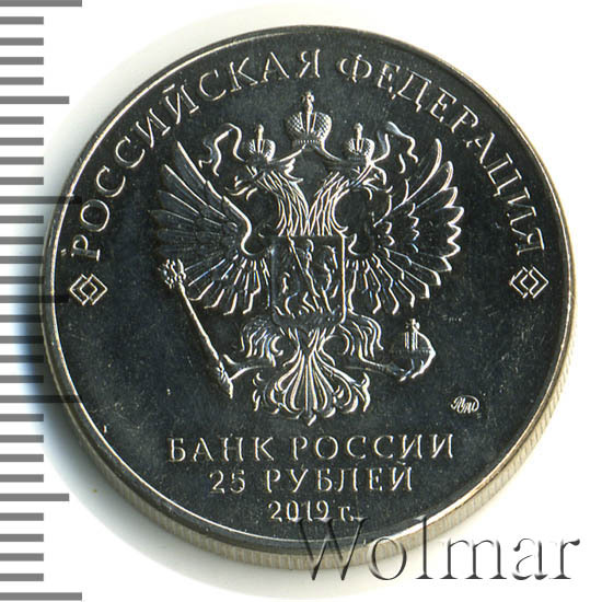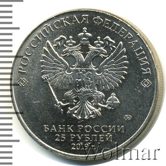 Рельефное изображение Государственного герба Российской Федерации, над ним вдоль канта — надпись полукругом «РОССИЙСКАЯ ФЕДЕРАЦИЯ», обрамленная с обеих сторон сдвоенными ромбами, справа — товарный знак монетного двора, внизу под гербом в центре в три строки — надпись: «БАНК РОССИИ», номинал монеты — «25 РУБЛЕЙ», дата — «2019 г.».