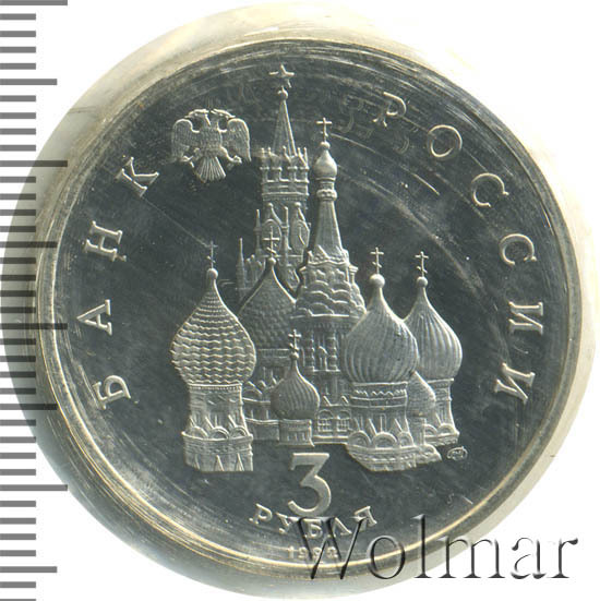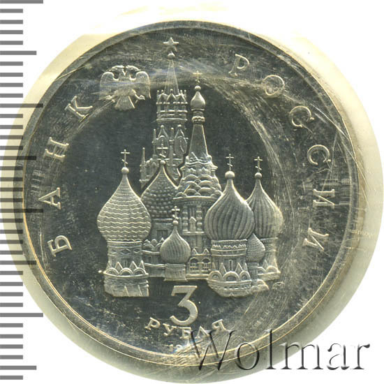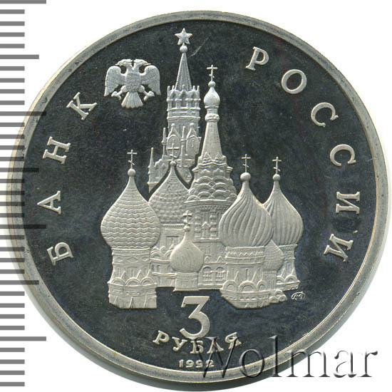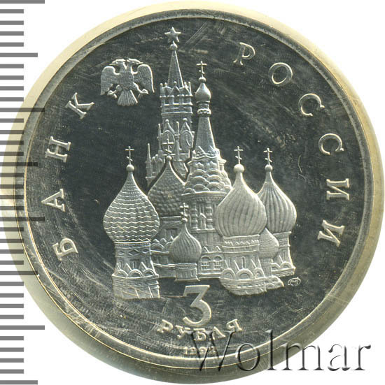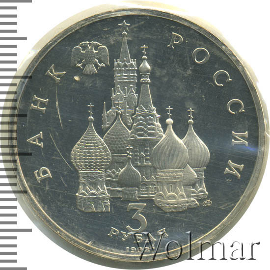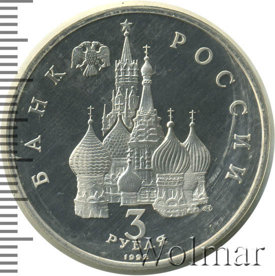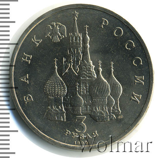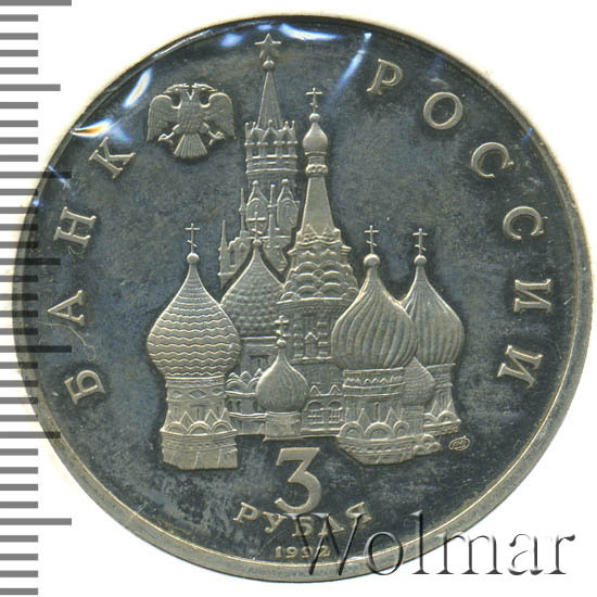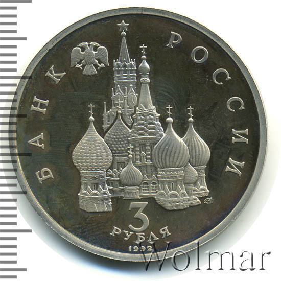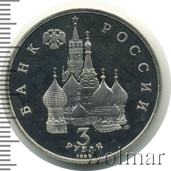 Сверху влево небольшое изображение двухглавого орла, слева слово «БАНК», справа «РОССИИ», внизу обозначение достоинства монеты - цифра «3» под ним слово «рубля», ниже год выпуска монеты «1992», в середине Собор Покрова Пресвятой Богородицы (собор Василия Блаженного) и за ним Спасская башня Московского Кремлля, чуть ниже и правее монограмма монетного двора «ЛМД».