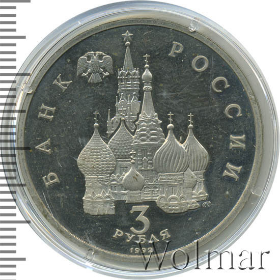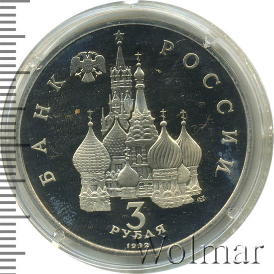 Сверху влево небольшое изображение двухглавого орла, слева слово «БАНК», справа «РОССИИ», внизу обозначение достоинства монеты - цифра «3» под ним слово «рубля», ниже год выпуска монеты «1992», в середине Собор Покрова Пресвятой Богородицы (собор Василия Блаженного) и за ним Спасская башня Московского Кремлля, чуть ниже и правее монограмма монетного двора «ЛМД».