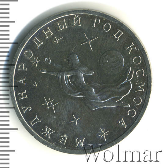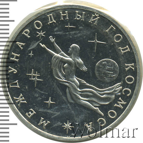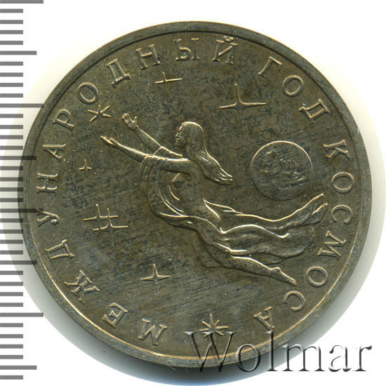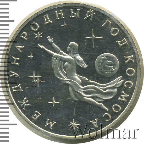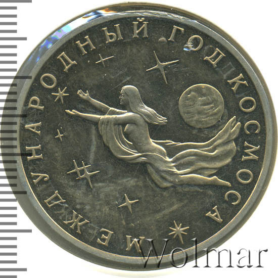 Символическое изображение созвездия Девы в виде летящей женщины на фоне звёздного неба, справа - изображение Земли, по окружности - надпись: "МЕЖДУНАРОДНЫЙ ГОД КОСМОСА", разделённая внизу звёздочкой.