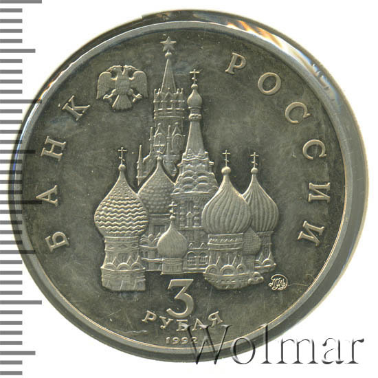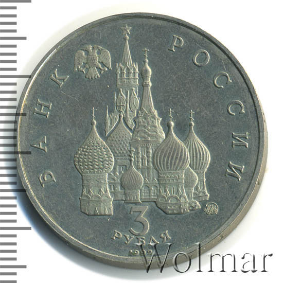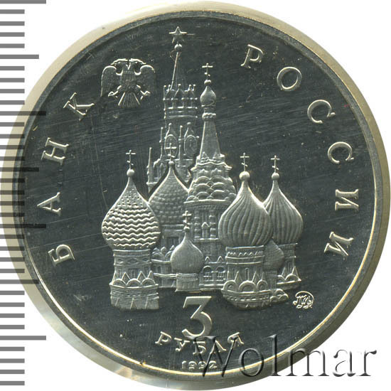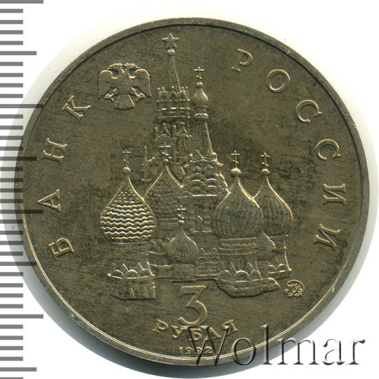 Сверху влево небольшое изображение двухглавого орла, слева слово «БАНК», справа «РОССИИ», внизу обозначение достоинства монеты - цифра «3» под ним слово «рубля», ниже год выпуска монеты «1992», в середине Собор Покрова Пресвятой Богородицы (собор Василия Блаженного) и за ним Спасская башня Московского Кремлля, чуть ниже и правее монограмма монетного двора «ММД».