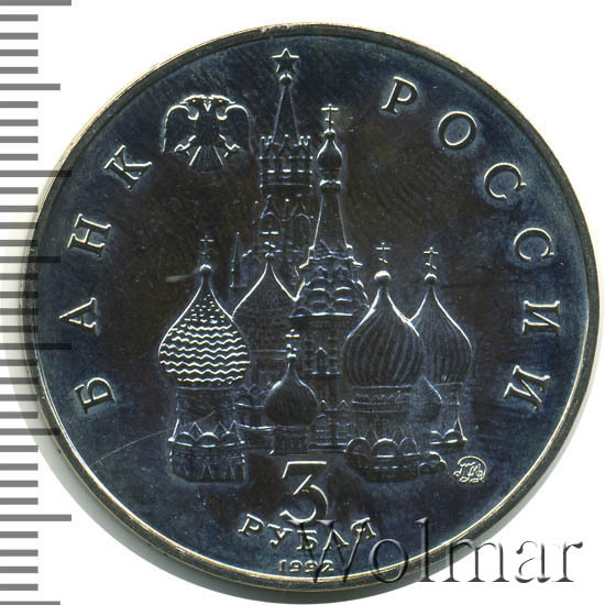 Сверху влево небольшое изображение двухглавого орла, слева слово «БАНК», справа «РОССИИ», внизу обозначение достоинства монеты - цифра «3» под ним слово «рубля», ниже год выпуска монеты «1992», в середине Собор Покрова Пресвятой Богородицы (собор Василия Блаженного) и за ним Спасская башня Московского Кремлля, чуть ниже и правее монограмма монетного двора «ММД».