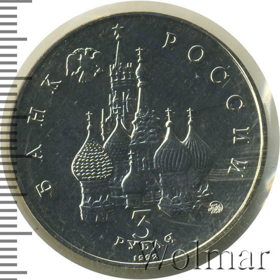 Сверху влево небольшое изображение двухглавого орла, слева слово «БАНК», справа «РОССИИ», внизу обозначение достоинства монеты - цифра «3» под ним слово «рубля», ниже год выпуска монеты «1992», в середине Собор Покрова Пресвятой Богородицы (собор Василия Блаженного) и за ним Спасская башня Московского Кремлля, чуть ниже и правее монограмма монетного двора «ММД».