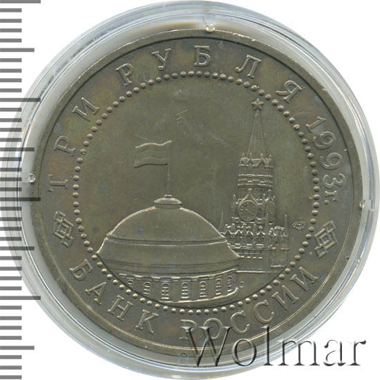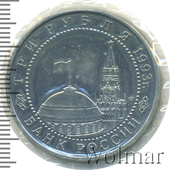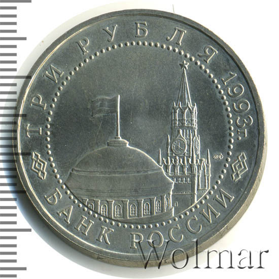 Вверху вдоль канта номинал «ТРИ РУБЛЯ» и год выпуска «1993 г.», внизу слова «БАНК РОССИИ». В середине в ободке из точек изображение Спасской башни Московского Кремля и частично перекрывающего ее купола Сенатского дворца с развевающимся флагом, с внутренней стороны точечного ободка справа монограмма монетного двора «ЛМД».